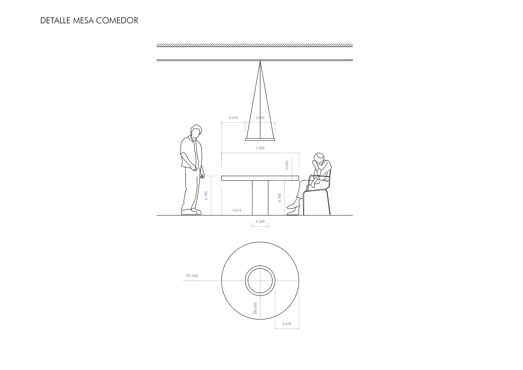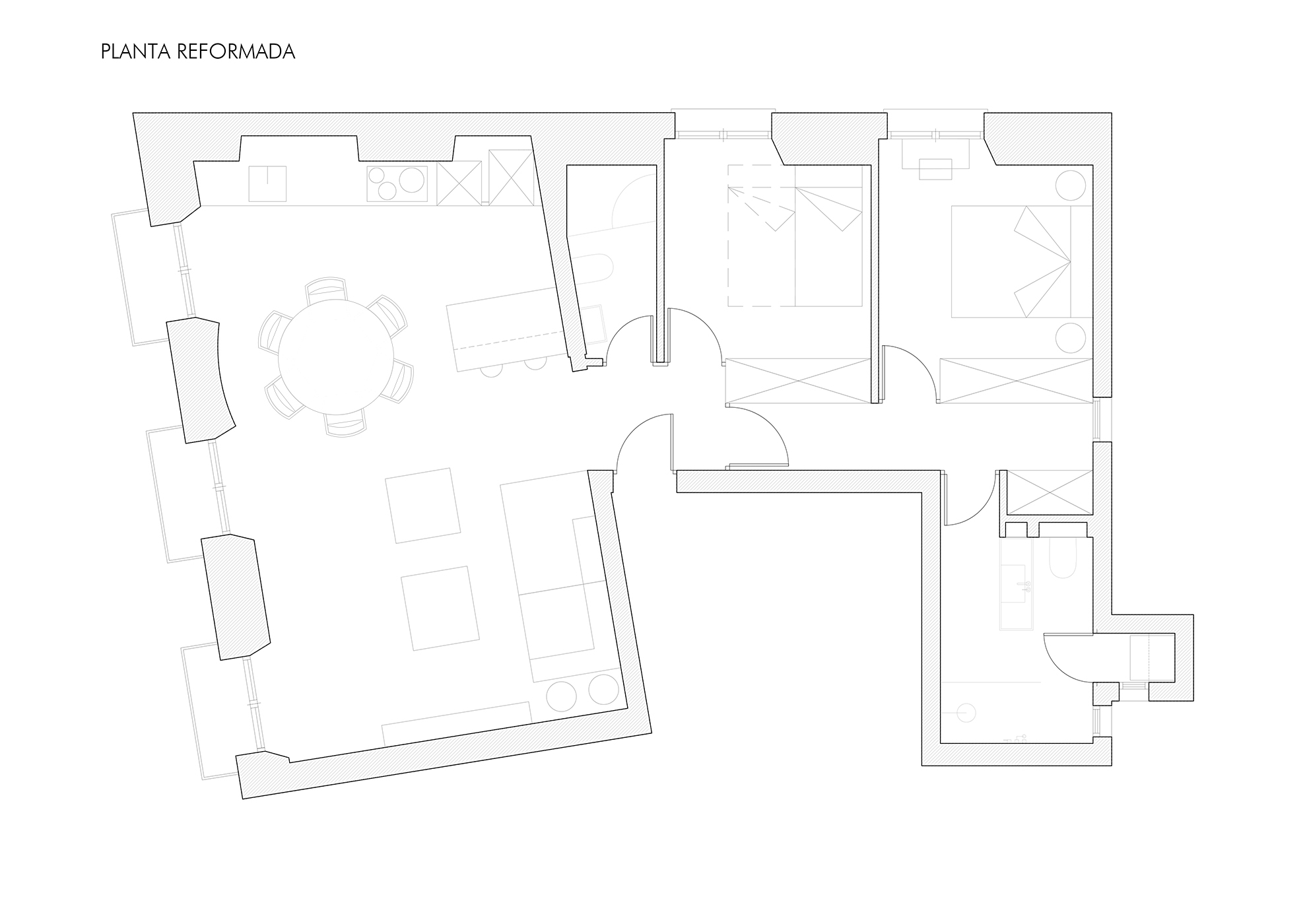 Haciendo esquina, dando tres balconeras a la calle principal y dos ventanales a la secundaria, el proyecto se organiza en un gran espacio central en torno a una mesa circular que se ancla al suelo, articulando los espacios de día y la propia vida de la casa. Todo gira en torno a ella: Comidas, trabajo, estudios, charlas y eventos de todo tipo.